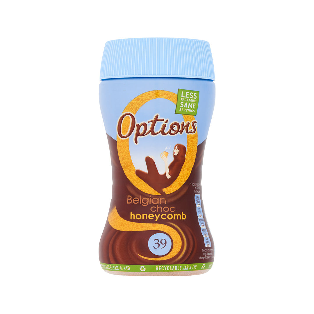 Options products are not available to customers outside of the UK Honeycomb flavour instant hot chocolate drink with sugars and sweeteners. A deliciously satisfying hot chocolate drink for those chocolatey moments that we all love. Perfect for any time of the day, so sit down, relax and enjoy. There's always something new to try - discover more Options - Options Hot Chocolate - Honeycomb Belgian Chocolate - 220g Jar - Instant Hot Chocolate