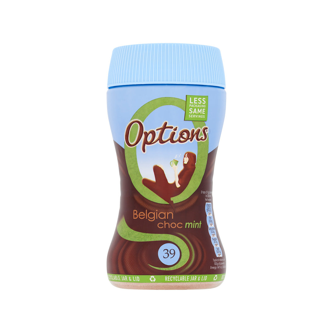 Options products are not available to customers outside of the UKMint flavoured instant hot chocolate drink with sugars and sweetener.A deliciously satisfying hot chocolate drink for those chocolatey moments that we all love. Perfect for any time of the day, so sit down, relax and enjoy. THERE'S ALWAYS SOMETHING NEW TO TRY - DISCOVER MORE OPTIONS - Options Hot Chocolate - Mint Belgian Chocolate - 220g Jar - Instant Hot Chocolate