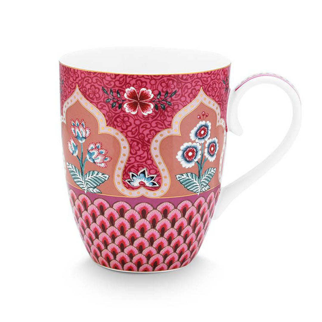 Add this Flower Festival large mug to your porcelain collection. The mug has a pink background and is decorated with the elegant Flower Festival design. This rich floral pattern features a variety of fanciful red and pink chintz flowers with light blue and green leaves. The playfully positioned flower branches with elaborately decorated flowers and leaves give this elegant design an extra luxurious look and feel. Pip Studio Flower Festival porcelain will make your China cabinet and table shine. View the other items in the Flower Festival porcelain collection for more inspiration and beautiful combinations. - Pip Studio Flower Festival Scallop Deco Mug - Pink
