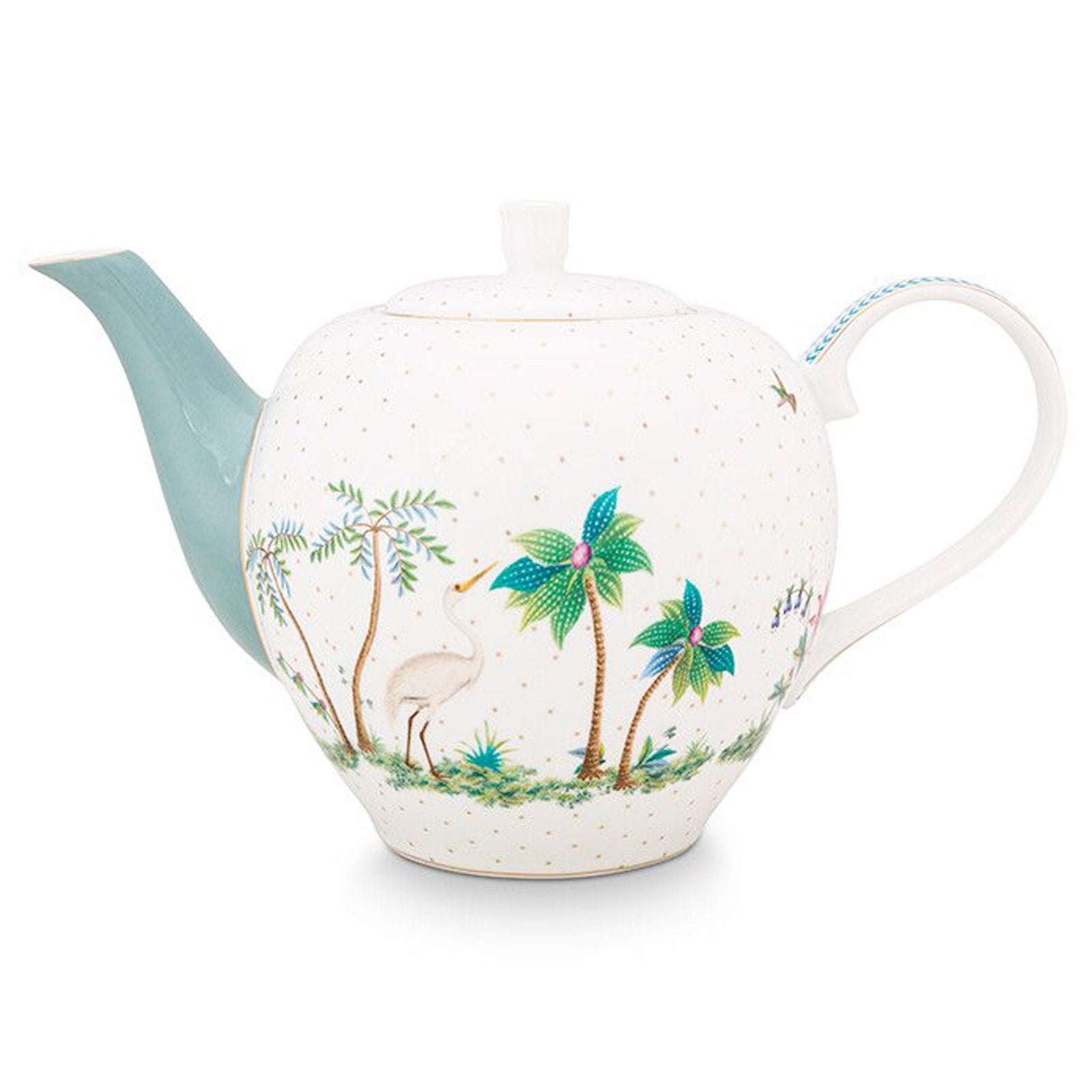 This tropical large teapot with a white background will take you on a trip to a treasured island. The teapot is decorated with unique tropical plants and flowers. Such as palm trees and various colourful fresh fruits. Furthermore,‚you will discover an exotic heron combined with lovely, pressed‚flowers and golden dots. The spout has a sky-blue‚colour which suits perfectly with the tropical vibes. Combine this teapot with other items of the Jolie collection for a stunning result. - Pip Studio Jolie Dots - Large Teapot - Perfect for Afternoon Tea Teapot - White & Gold - Teaware - Tea Lover Gift