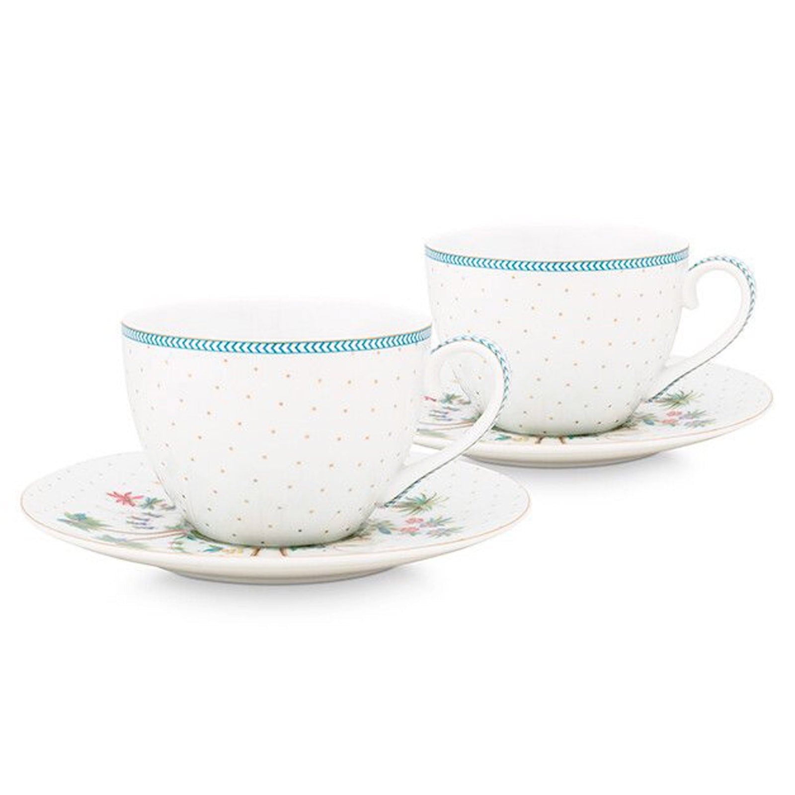 A perfect‚set of 2 cups and saucers for all your hot drinks. This Jolie Cup & Saucer set gives you a festive and tropical vibe because of its beautiful decoration. On the white background you will find golden dots and a golden detail on the edge. Furthermore,‚the cups are decorated with palms, colourful flowers and exotic species. The handle of the cups is‚also decorated with blue details,‚fitting in with the tropical vibes perfectly. They also come in an elegant gift box, making them the perfect gift. - Pip Studio Jolie Dots - Set of 2 Cups & Saucers - Perfect for Afternoon Tea - White & Gold - Teaware - Tea for Two Set