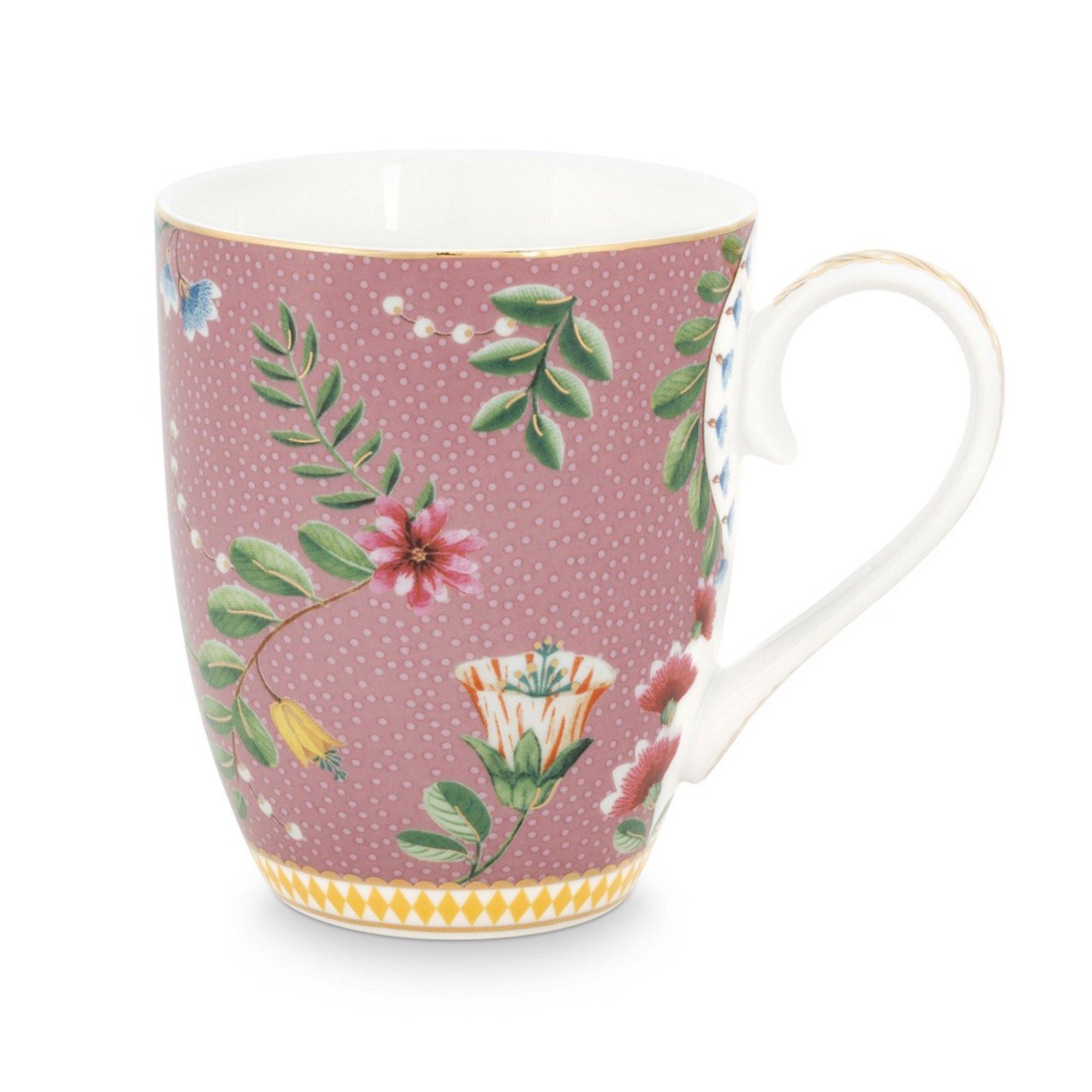 This pink porcelain mug is decorated all around with exotic flowers and golden details on a pink background. Combines beautifully with the other porcelain sets in the La Majorelle collection. - Pip Studio La Majorelle Mug - Pink