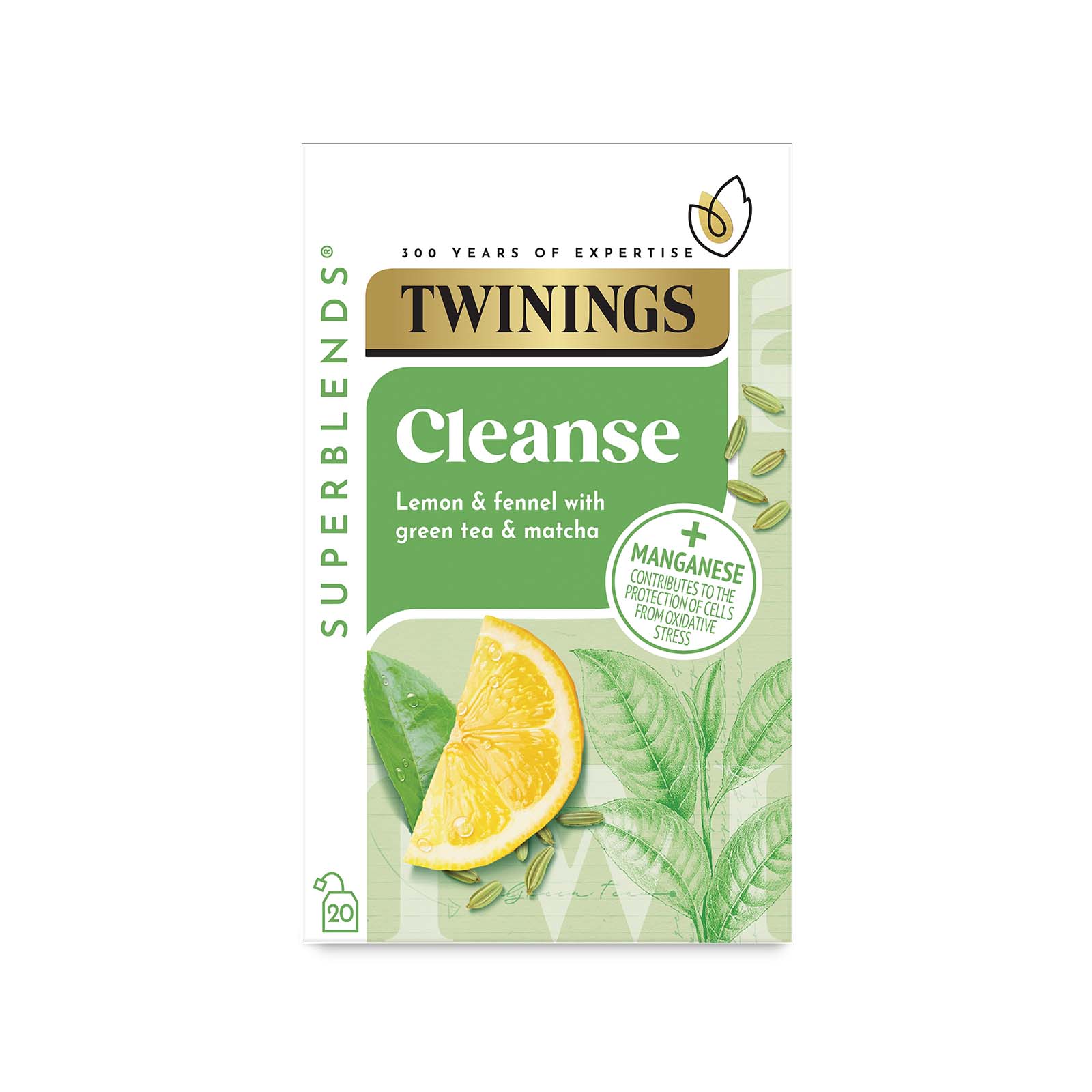 Lemon flavoured Green Tea with Matcha, Fennel and added Manganese Discover the perfect pick me up when life leaves you feeling heavy. We have over 300 years experience blending teas that taste amazing and make you feel great. Working with our expert herbalist, Pamela Spence, our master blenders have crafted this green tea and matcha blend with a cleansing, citrusy taste, which will leave you feeling refreshed. Take a moment to clear your mind and enjoy a cup of Cleanse. What does it taste like? This balanced blend combines vegetal notes of matcha with sweet fennel seed and fresh citrus notes to deliver a bright fresh blend. Part of our Superblends range - Our delicious range of benefit-led green teas and infusions, expertly blended with an added botanical, vitamin or mineral to support your everyday wellbeing. - Twinings Superblends - Cleanse Matcha - Green Tea, Lemon & Fennel Green Tea Infusion - Added Manganese - Health Tea Drink 20 Tea Bags