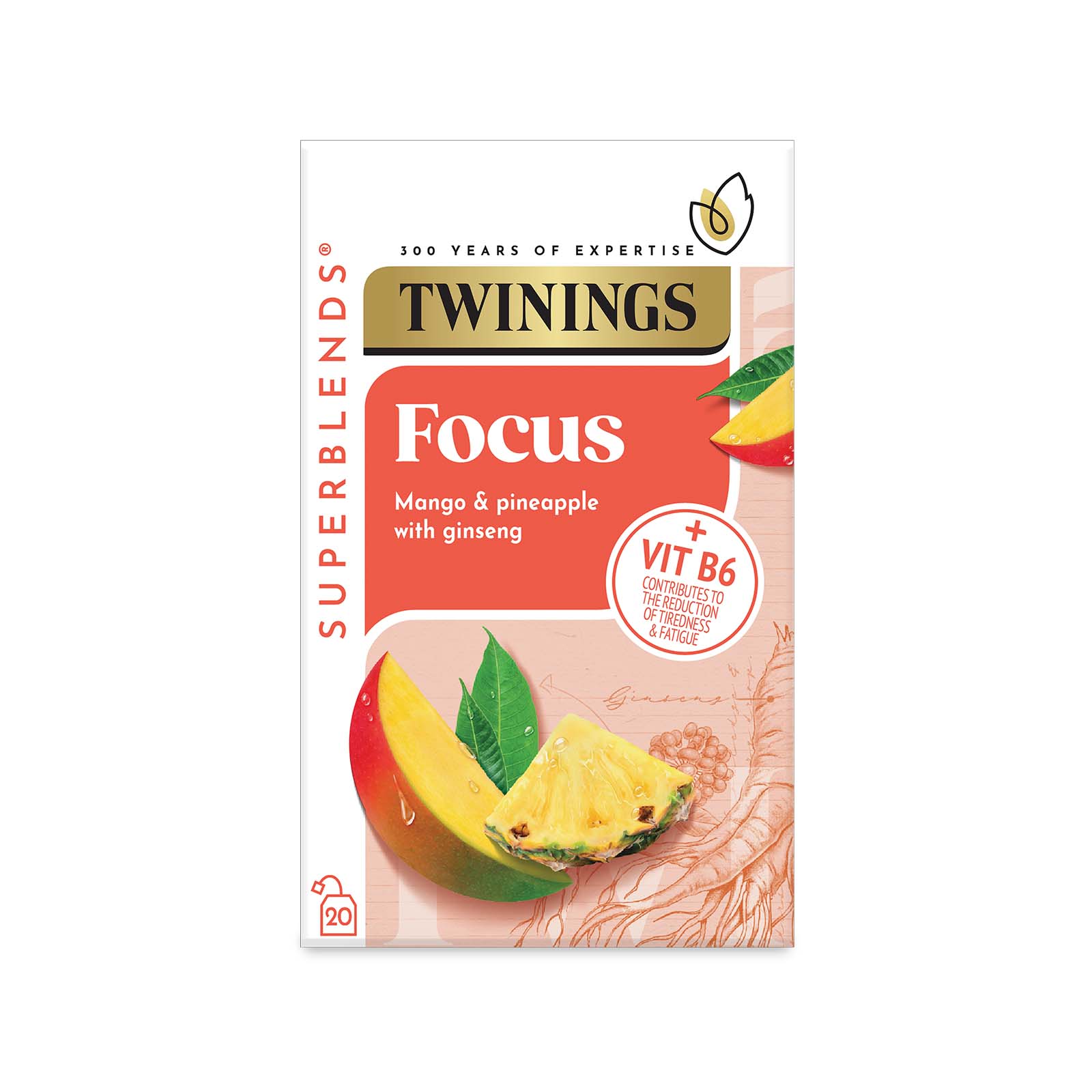 Mango and Pineapple Flavoured Herbal Infusion with Ginseng Root and added Vitamin B6. We all need help sometimes to see the wood for the trees. This is the inspiration behind the carefully crafted naturally caffeine free focus blend. A moreish flavour combination of sweet mango, tart pineapple and earthy ginseng root is perfect when you need a pick me up. +Vitamin B6 contributes to the reduction of tiredness and fatigue. Enjoy at least 1 cup a day as part of a varied and balanced diet and a healthy lifestyle. What does it taste like? Sweet with a subtle sharpness, you will want to drink this all day long. Part of our Superblends range - Our delicious range of benefit-led green teas and infusions, expertly blended with an added botanical, vitamin or mineral to support your everyday wellbeing. - Twinings Superblends - Focus - Mango & Pinapple with Ginseng Flavoured Herbal Infusion - Added Vitamin B6 - Health Tea Drink 20 Tea Bags