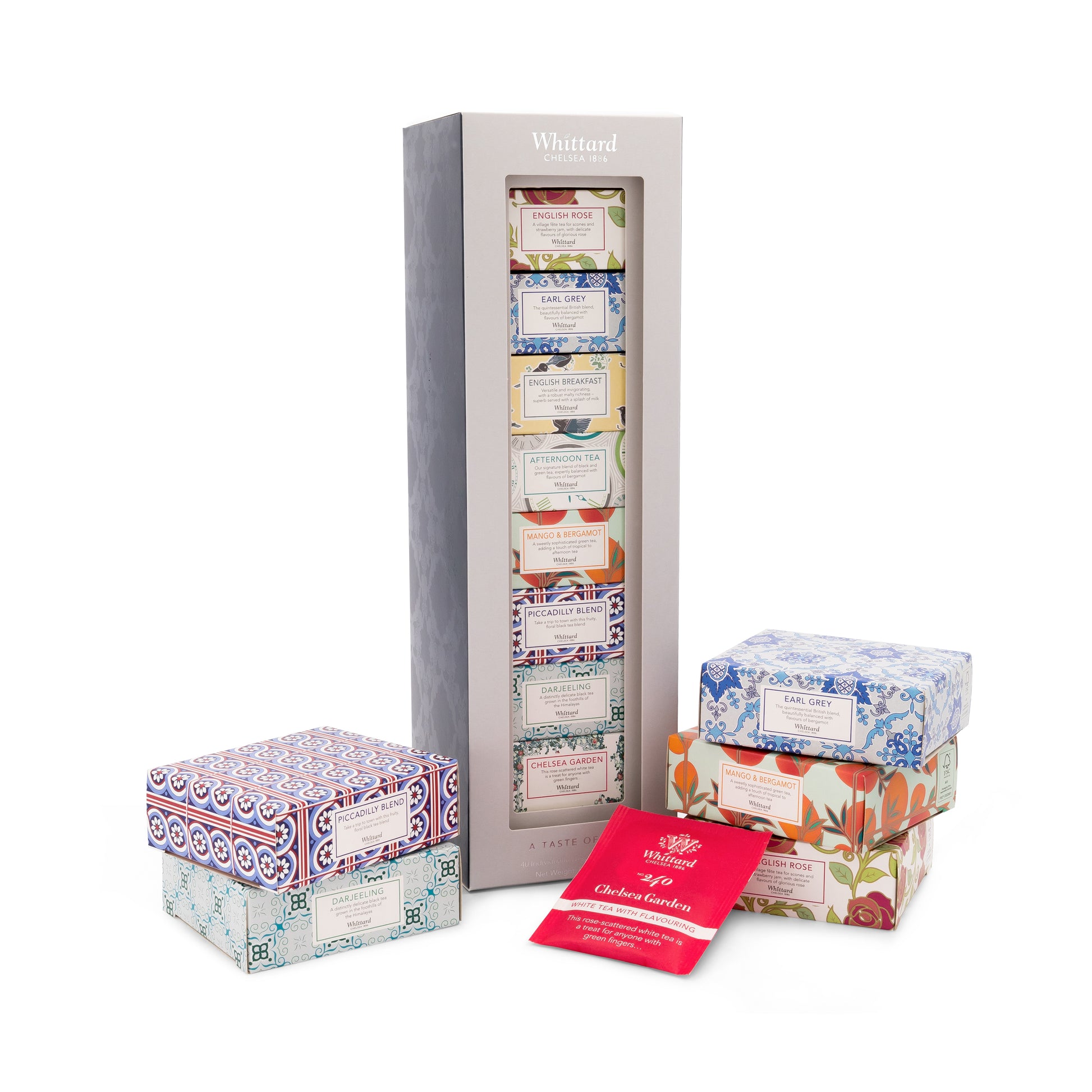 English Breakfast and Darjeeling are two classic black teas, while Piccadilly Blend, Mango Bergamot and Earl Grey are twists on a very British blend Then there's English Rose, infused with gentle floral notes, and Afternoon Tea, our signature blend for elegant tea parties Finally we've added our delicate Chelsea Garden white tea With five individually wrapped teabags of each tea, it's a glorious treat for your taste buds Teas featured: English Breakfast, English Rose, Afternoon Tea, Earl Grey, Darjeeling, Piccadilly Blend, Mango Bergamot and Chelsea Garden Tea types included: 2 x Black Tea, 1 x White Tea with Flavouring, 4 x Black Tea with Flavouring, 1 x Green Tea with Flavouring Number of servings (using 2g per cup): 8 x 5 individually wrapped teabags = 5 cups of each tea that's a grand total of 40 cuppas! Ideal for using with: Chelsea Glass Teapot with Infuser , Glass Pao Mug with Infuser or Tea Discoveries Tea Cup Saucer Serving suggestion: Enjoy hot